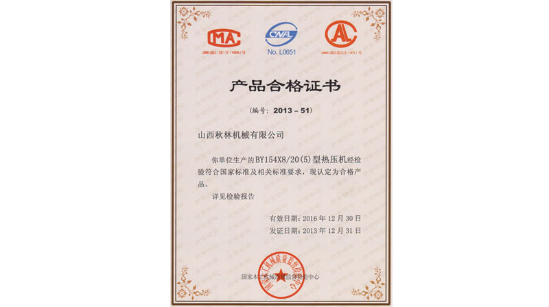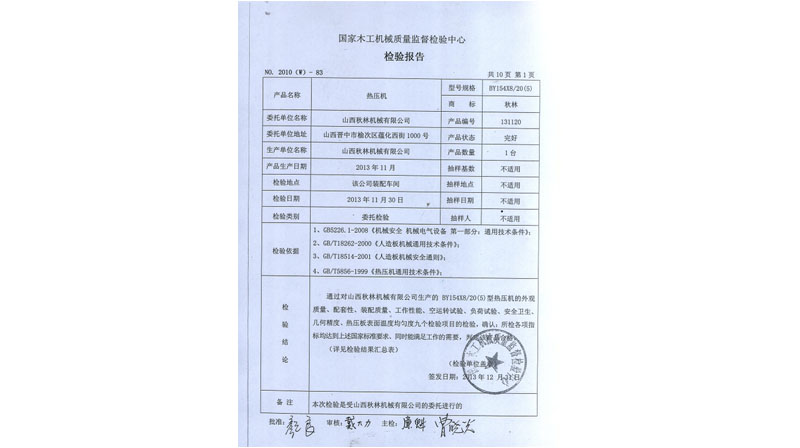 BY21型熱壓機(jī)、BY624×8/16、BY154×8/20(5)通過國(guó)家木工機(jī)械質(zhì)量監(jiān)督檢驗(yàn)中心檢驗(yàn)